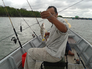 Oleh kerana tiada getuan langsung di lokasi terdekat, dengan air yang bertukar warna, saya terpaksa membawa mereka ke lokasi yang berpotensi walaupun jauh. Masa berjalan dan keputusan mesti dibuat dengan cepat. Setelah menjala udang di laluan bot ke pulau ketam, saya mengambil keputusan berani menghala ke Pulau Ketam. Macam biasalah umpan udang hidup yang saya jala sebagai sedikit ikhtiar.