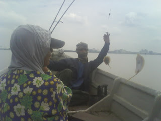 Amboi Bonda ku dengan ikan Galama Papan besar nya. Ketika ini kami sedang sibuk menjerat Siakap dan Sesumpit. Jadi Bonda amik alih menjaga tiga joran sekali..